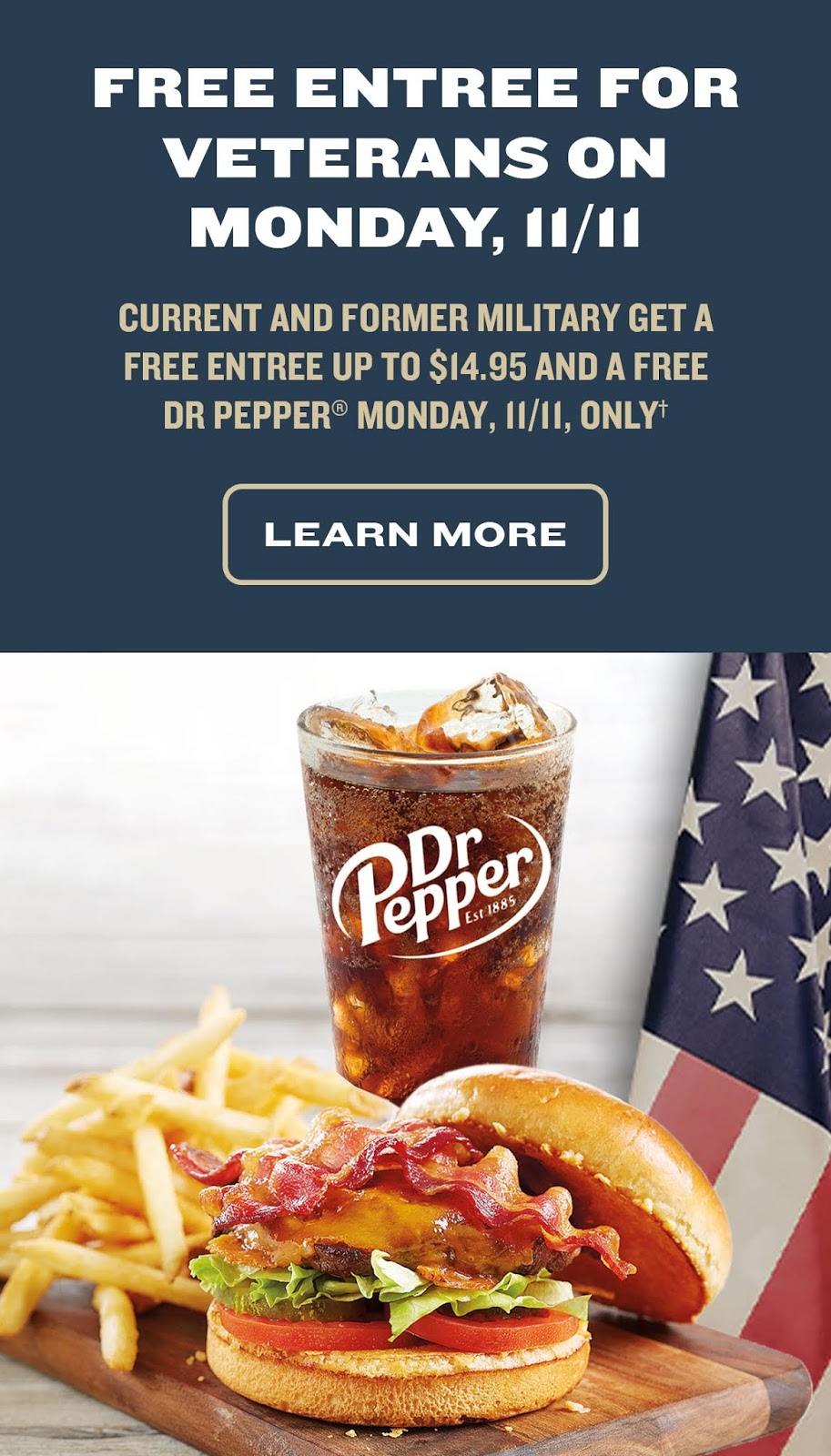 In celebration of Veterans Day, all current and former military can enjoy a FREE entree up to $14.95 and a FREE Dr Pepper® beverage!†Valid for Dine In Monday, November 11, only.Must present Military ID or other proof of service.