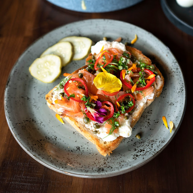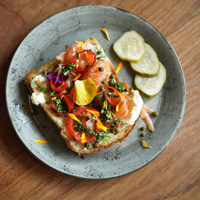 I am enamored with the beautifully dressed Salmon Toast at Provision! The stunning dish is on seeded grain bread topped with cured salmon, caper, and an incredible pickled fresno pepper & parsley mint mojo.