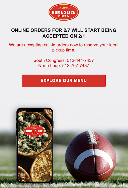 Home Slice Don\’t miss out, Home Slice is now accepting future orders to make sure you\’re fully stocked on beer, pizza, and wings* for the big game!