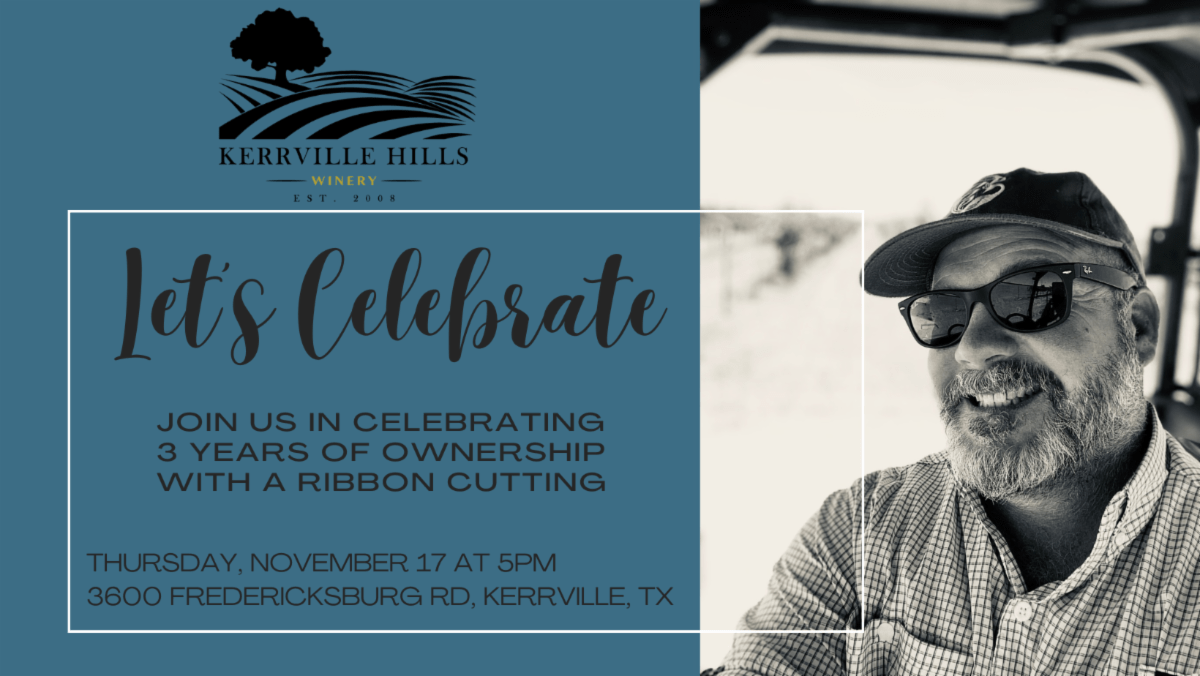 Details: Wine lovers! Join Kerrville Hills Winery in celebrating 3 years of ownership under John Rivenburgh with wine and a special ribbon cutting ceremony. The celebration starts at 5:00 p.m. at the winery located at 3600 Fredericksburg Rd., Kerrville, TX.