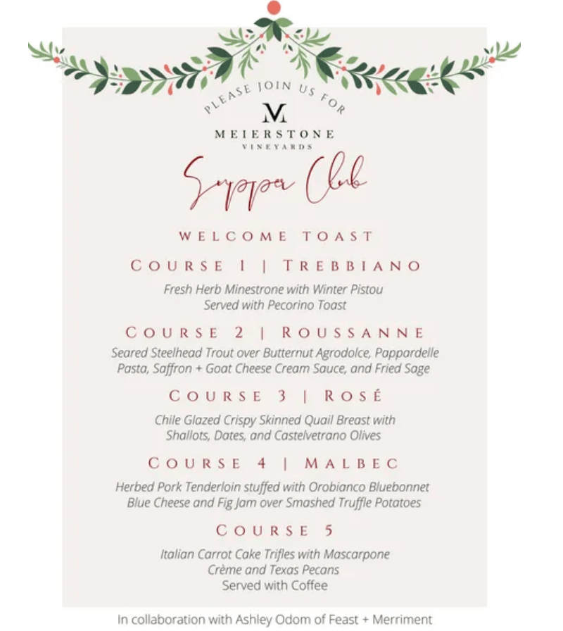 Celebrate the holidays in the hill country! Join us for a dazzling supper club featuring a five-course meal by Feast & Merriment, paired with wines by Meierstone Vineyards.