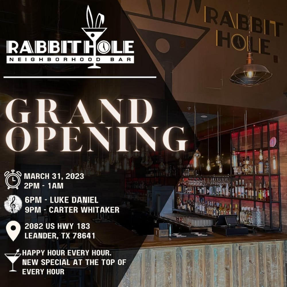The Rabbit Hole will officially open on Friday, March 31 starting at 2 p.m. with a Grand Opening party that will feature live music by Luke Daniel from 6-9 p.m. and Carter Whitaker from 9 p.m. – midnight. A special time-related happy hour will also take place that will offer new specials for guests to enjoy at the top of every hour. The neighborhood bar is located in the San Gabriel Ridge shopping center at 2080 N. US-183 unit 145. Owners Matt Morcher and Sandra Cleveland and Matt and Shelly Delahoussaye are part of the team at The Lucky Rabbit, which opened roughly one year ago in Jonestown and has seen incredible success.