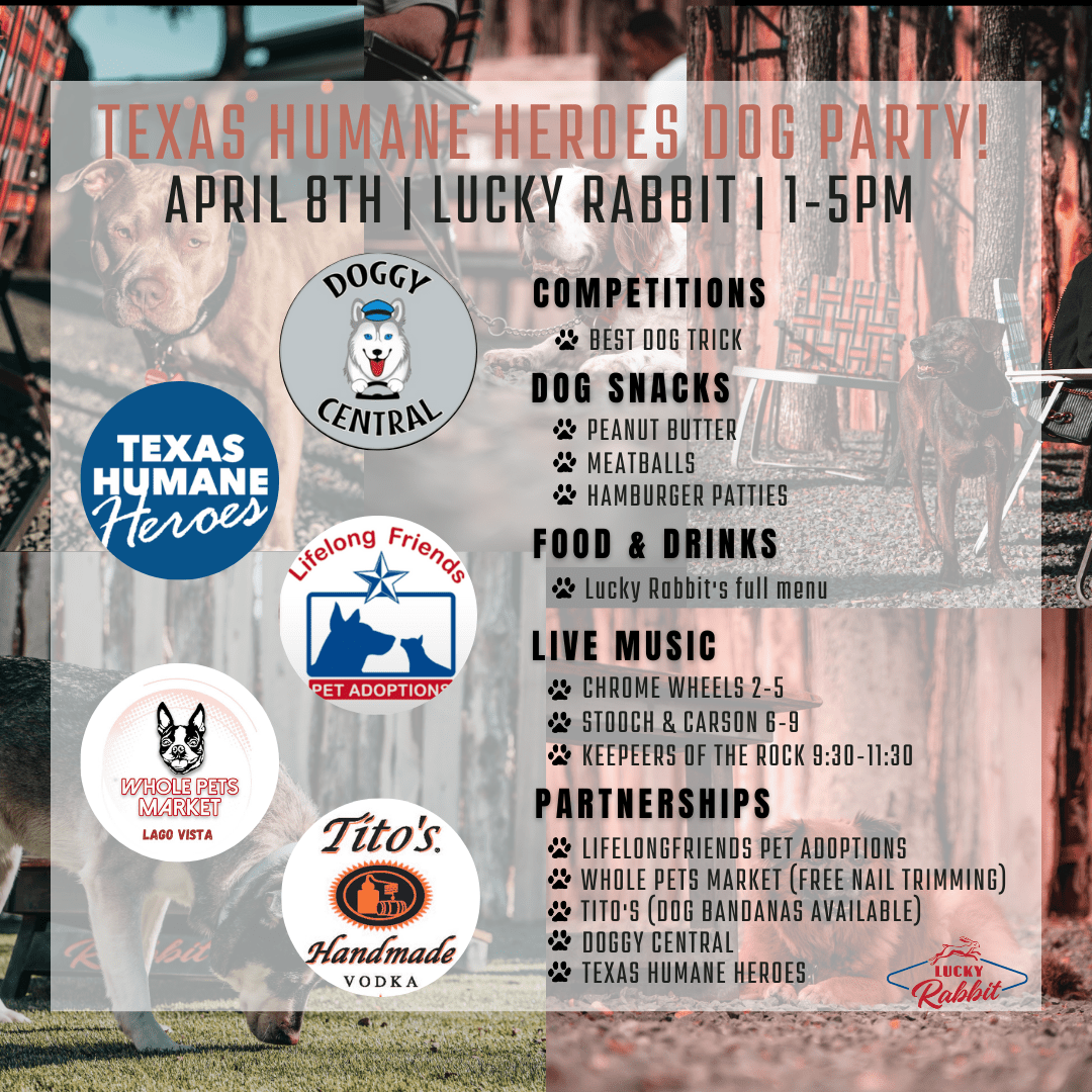 Dog Adoptions from Texas Humane Heroes, Puppy Party Favors from Tito’s, Free Nail Trims, and More! WHAT: Calling all dogs and their humans! You’re invited to come spend a day pampering your pooch at The Lucky Rabbit Live Music Bar & Kitchen’s Dog Party on Saturday, April 8. The Texas Humane Heroes team will beContinue reading “Dog Party at The Lucky Rabbit – April 8”